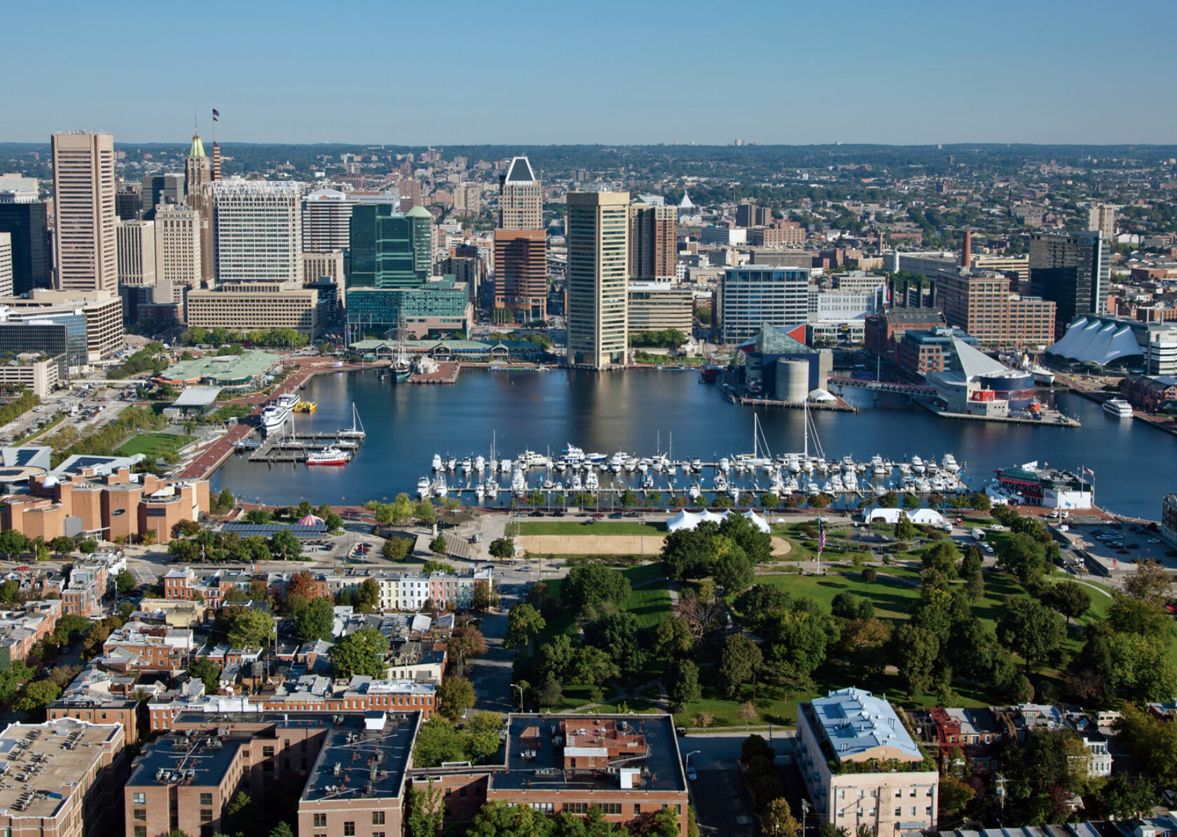 Situated between Harbor East and Fell’s Point on a former industrial site, Harbor Point is Baltimore’s newest waterfront neighborhood. This flourishing mixed-use community is anchored by Exelon’s $270-million Baltimore headquarters. The 20-story LEED Gold building houses 1,500 of this Fortune 100 energy company’s employees. Other neighborhood attractions include the 17-story luxury apartment building 1405 Point and Point Park, a 4.5-acre public space swith sprawling views of the water and downtown skyline.